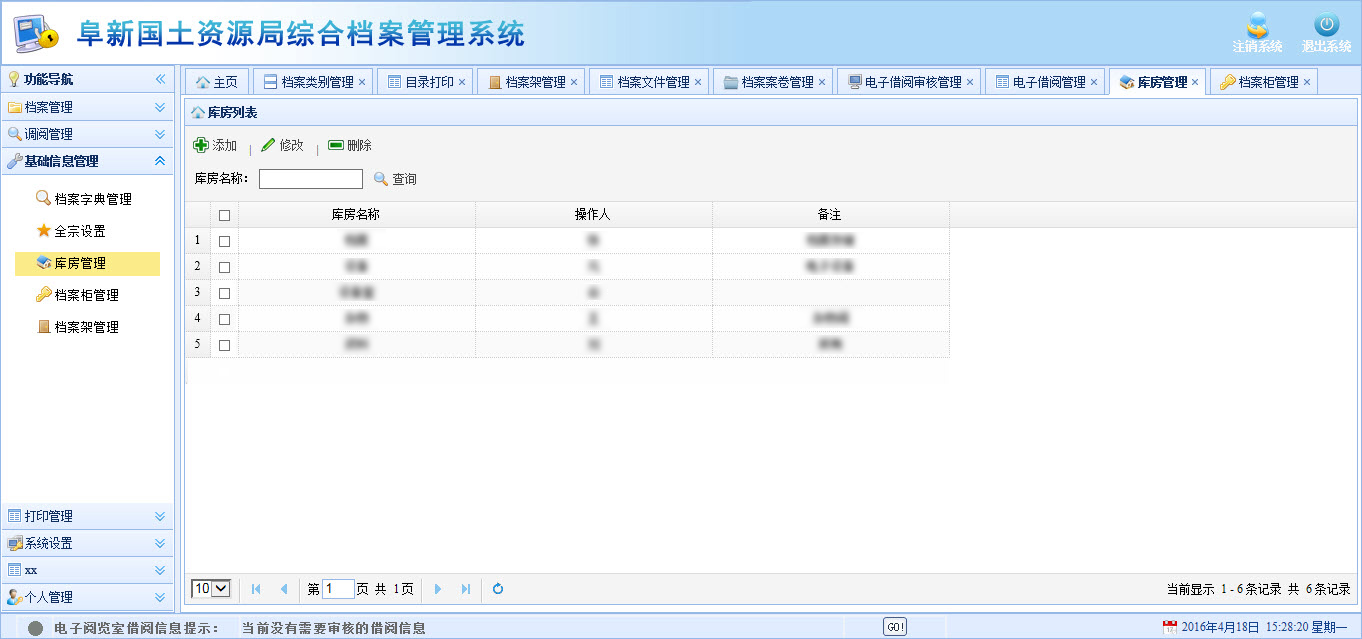 用户操作简单、便捷。库房管理是用来管理纸质综合档案资料。档案资料电子化后,纸质材料需要入库完善保存,并且明确材料保存的具体位置,以便日后的取用。通过库房管理功能可以便捷的找到档案资料在哪一个库房、哪一个档案柜以及哪一个档案架上,极大方便了工作人员的日常工作。