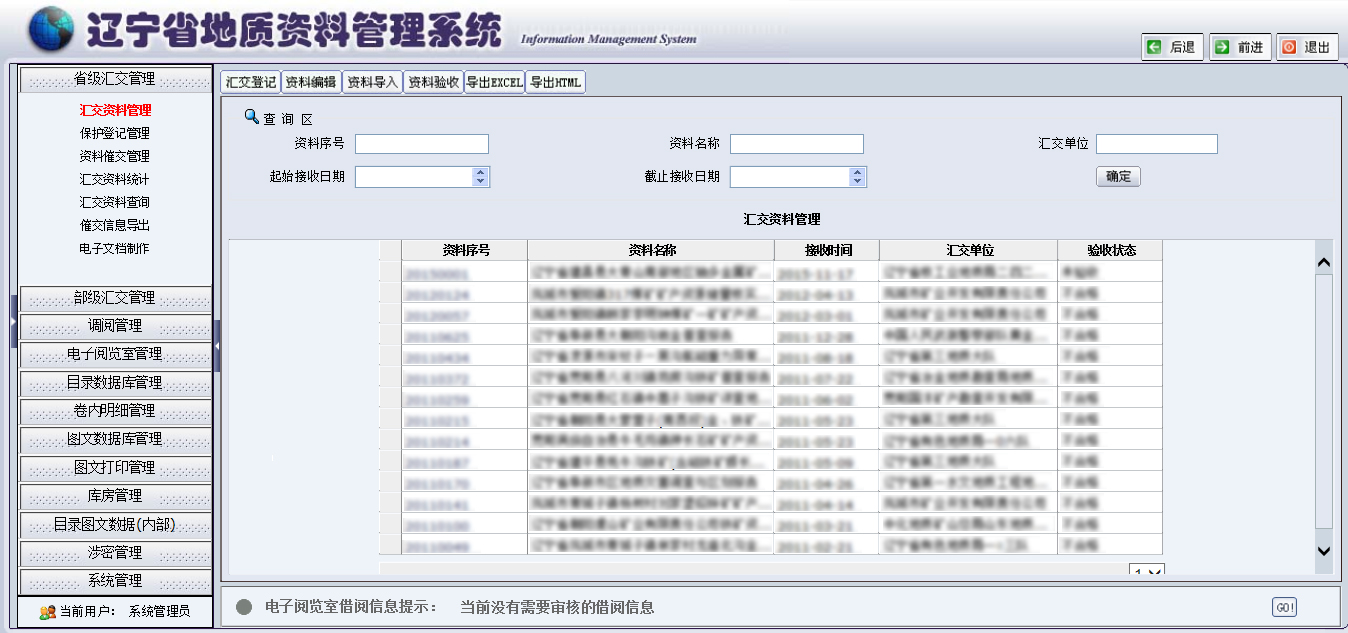 该系统整合了目录数据库、涉密数据库、图文数据库及工作信息等基本数据,集成了汇交管理、库房管理、借阅管理、涉密证书管理、电子阅览室等14个功能。实现了与省级“矿政一张图”数据共享;实现了采矿许可证、勘查许可证到期自动提示应汇交地质资料相关信息,为全面执行地质资料汇交制度,提供准确可靠的信息。